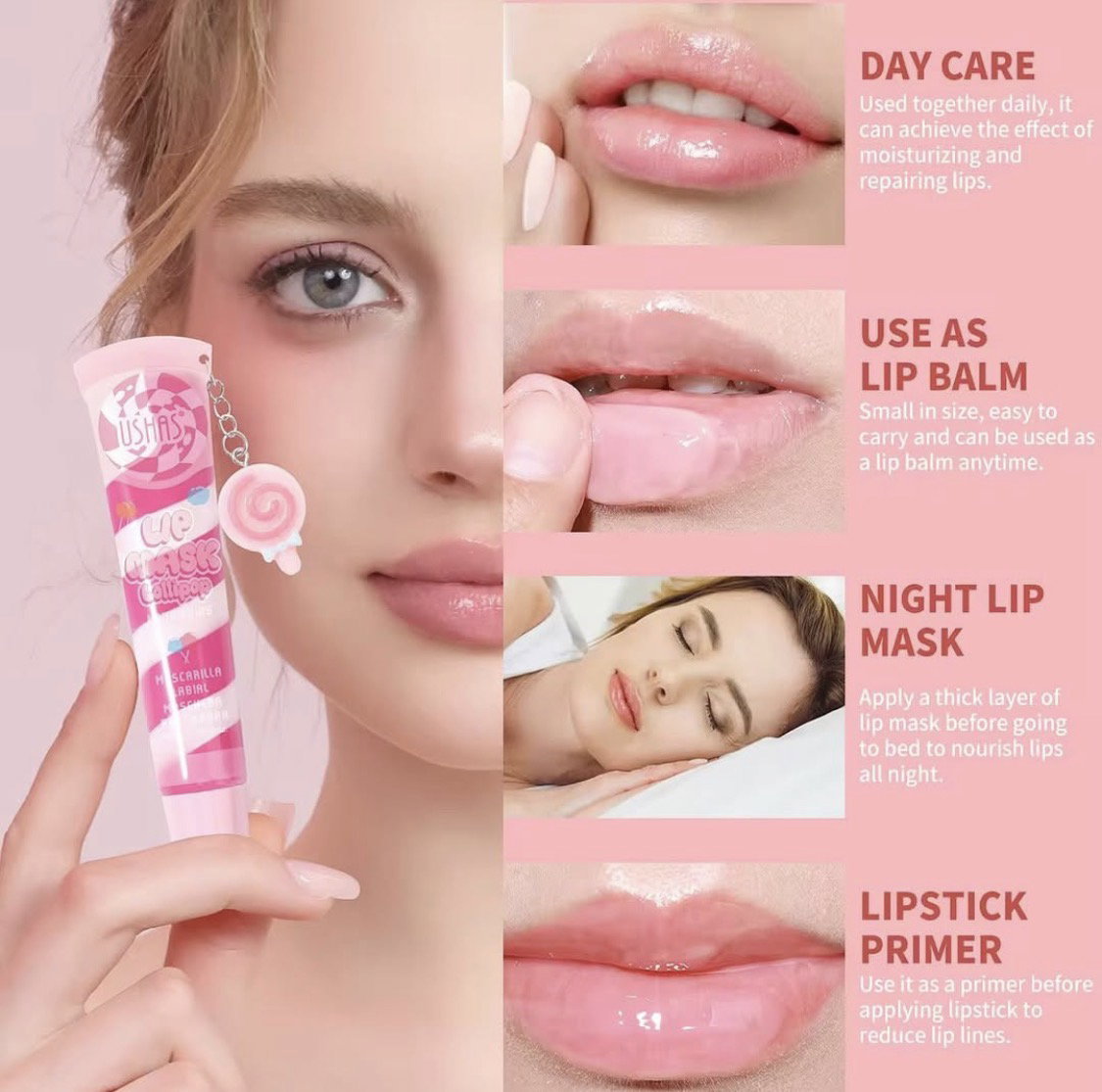 La Lip Mask Lollipop de Ushas es una mascarilla labial nutritiva diseñada para hidratar, suavizar y dejar los labios con un efecto jugoso irresistible. Su textura cremosa repara la resequedad, aporta brillo saludable y ayuda a mantener la barrera natural del labio.