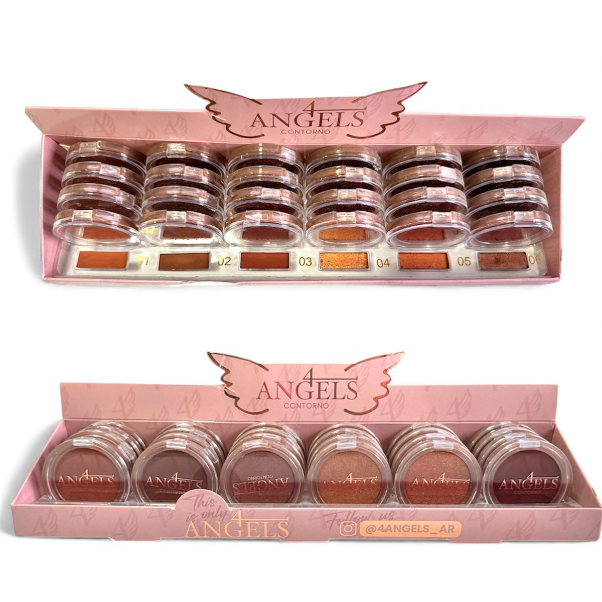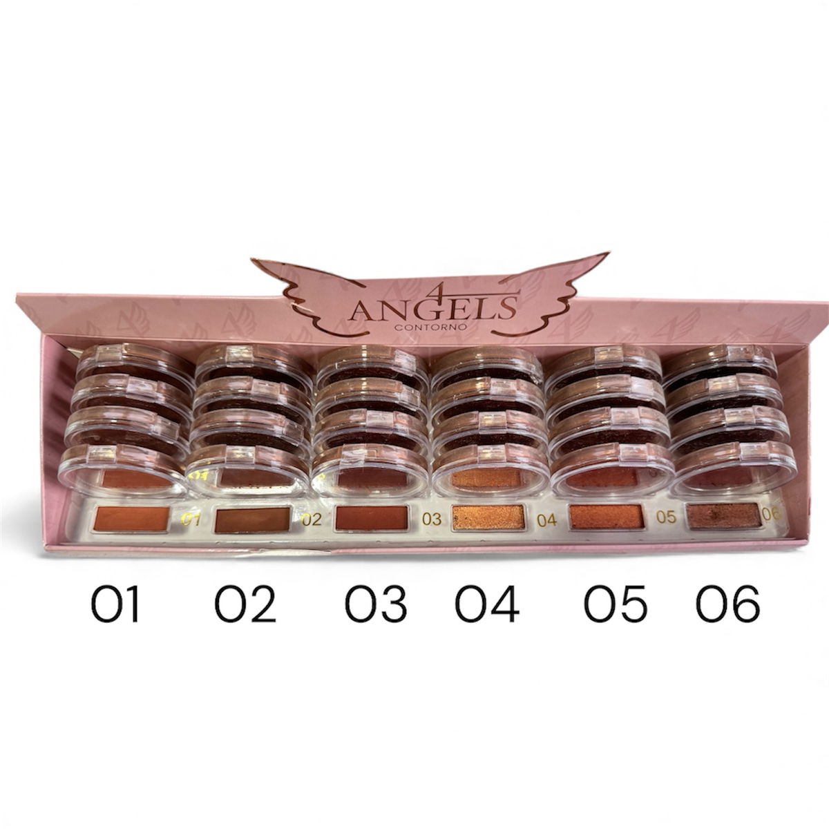 Contorno 4 Angels: polvos suaves y ultra pigmentados que definen, esculpen y broncean el rostro con acabado natural. Disponible en 6 tonos para adaptarse a cada tipo de piel.